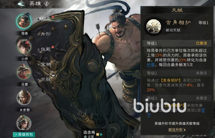周泰的核心机制围绕“主动承伤”展开。其被动技能“不屈”可在队友受到攻击时,依据敌方兵力百分比阈值,按概率承担该次全部伤害;每回合最多触发3次,形成稳定可靠的减伤链。这一特性使其成为脆皮主力输出(如太史慈、凌统等)的理想守护者,有效延缓敌方集火清场节奏。值得注意的是,周泰自身承伤后虽输出有限,但其存在本身即大幅提升了我方核心单位的存活率与持续作战能力。