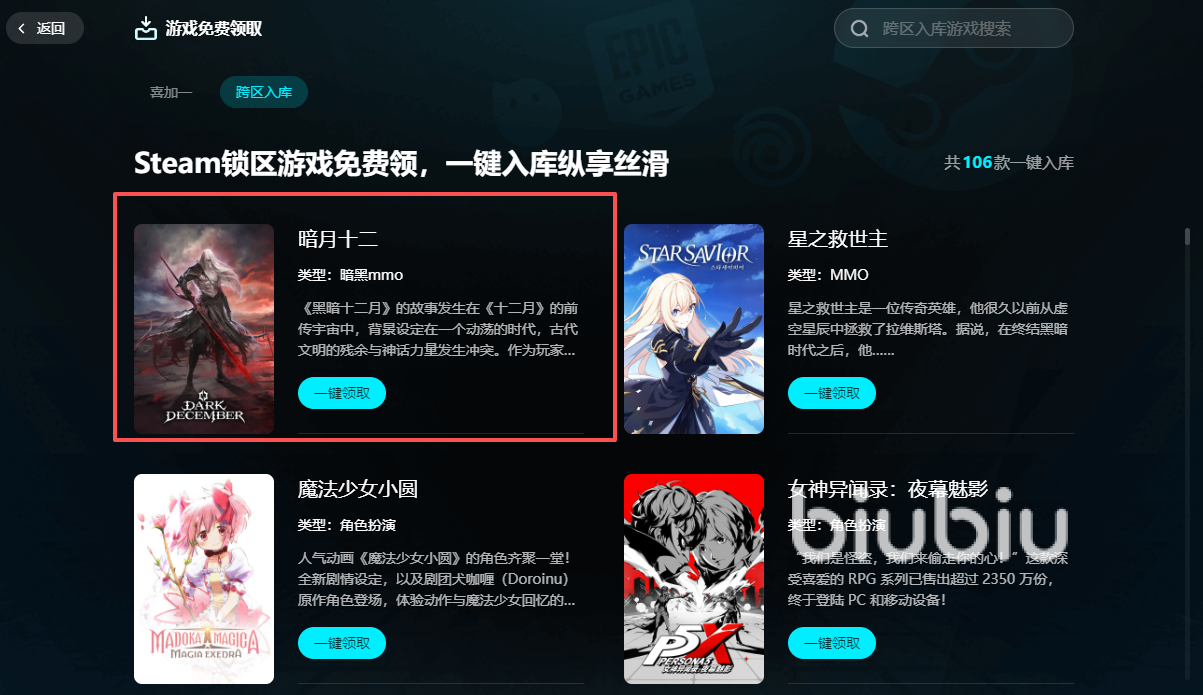为提升操作效率,biubiu加速器内置“跨区入库”功能。在加速界面右侧点击“免费领取”,进入后选择“跨区入库”,首项即为《Dark December》(暗月十二),一键完成绑定与下载,全程无需手动跳转或重复验证。