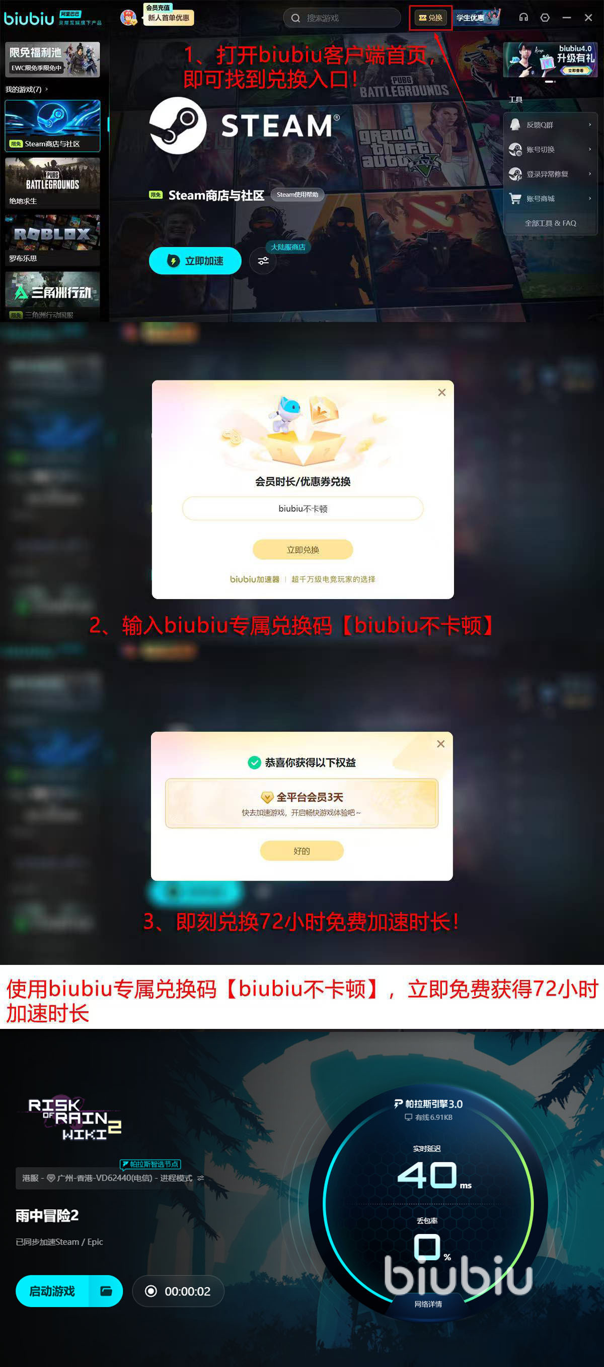 对于《雨中冒险2》玩家而言,启用biubiu加速器后,不仅可显著降低多人模式闪退率,还能同步改善卡顿、跳帧、输入延迟等前期征兆类问题,全面提升联机体验一致性。目前新用户注册即享基础加速权益:完成账号激活后自动获得24小时免费使用时长;随后进入客户端首页“兑换”入口,输入专属口令【biubiu不卡顿】,即可额外领取72小时加速权限。两项权益支持叠加,总计可体验96小时全功能服务,建议首次启动后立即领取并激活。