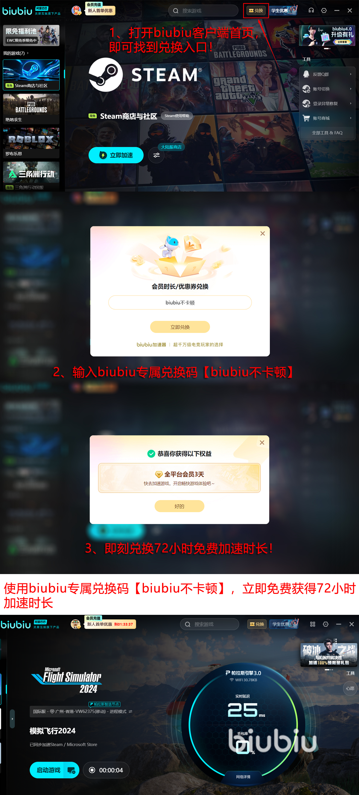新用户完成注册后,可立即领取24小时全功能试用权限;所有用户输入兑换码【biubiu不卡顿】,还可额外激活3天高级加速服务。该时段足以支撑完成一次完整的跨洲际航线模拟,包括起飞准备、巡航监控、进近导航与精准着陆全流程,切实保障飞行连续性与操作可靠性。