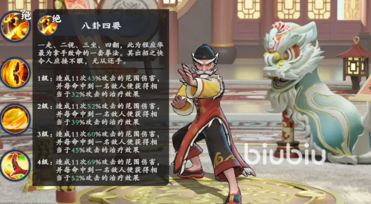 最后一位是程应华。他以掌法为核心战斗风格,绝招可发动11段范围连击,每段造成43%攻击力的伤害,总倍率可观。更关键的是,每次命中敌方单位均可为其自身恢复32%攻击力的生命值。该治疗量随命中敌人数量线性叠加,使其在中排站位时具备极强的续航韧性——面对多目标围攻反而愈战愈勇。因此,程应华在中后期团战中往往越战越稳,站场时间与持续作战能力极为出色。