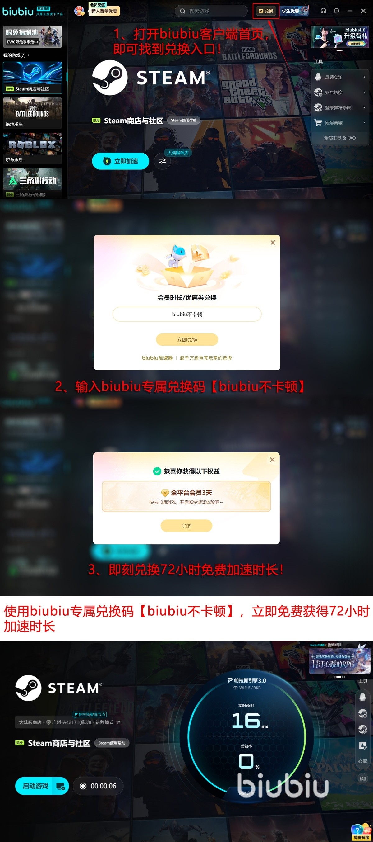 那么相信大家已经心动了吧,现在还有一个免费体验的好机会!各位用户输入这个【biubiu不卡顿】兑换码,就能免费拿的三天的全功能加速权益。如果你是新人,首次注册登录就有自动激活24小时体验时长,叠加之后有长达96小时的免费时长,足够让你逛商城买新作,在线更新和下载都能高速完成。