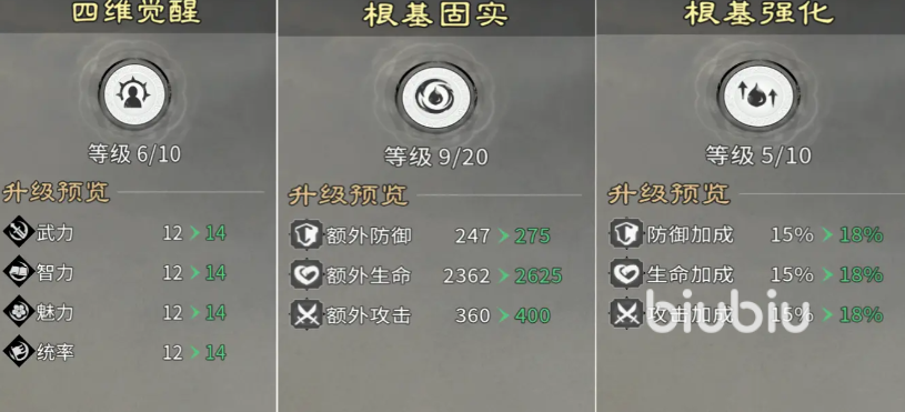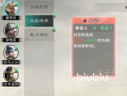 相同数量的训练心得用于技能升级,所能带来的战力增幅远高于其他途径。以穿杨军主动技能为例:从6级升至7级,伤害倍率由192%提升至204%;藤甲兵被动减伤效果亦随技能等级线性叠加。因此,主力兵种的技能等级务必优先拉满。待核心技能达到上限后,再转向能力强化模块。推荐首点【思维觉醒】,该强化提供直观且可观的战力加成;其次选择【根基牢固】,每级固定增加防御数值,投入产出比显著优于同类选项。