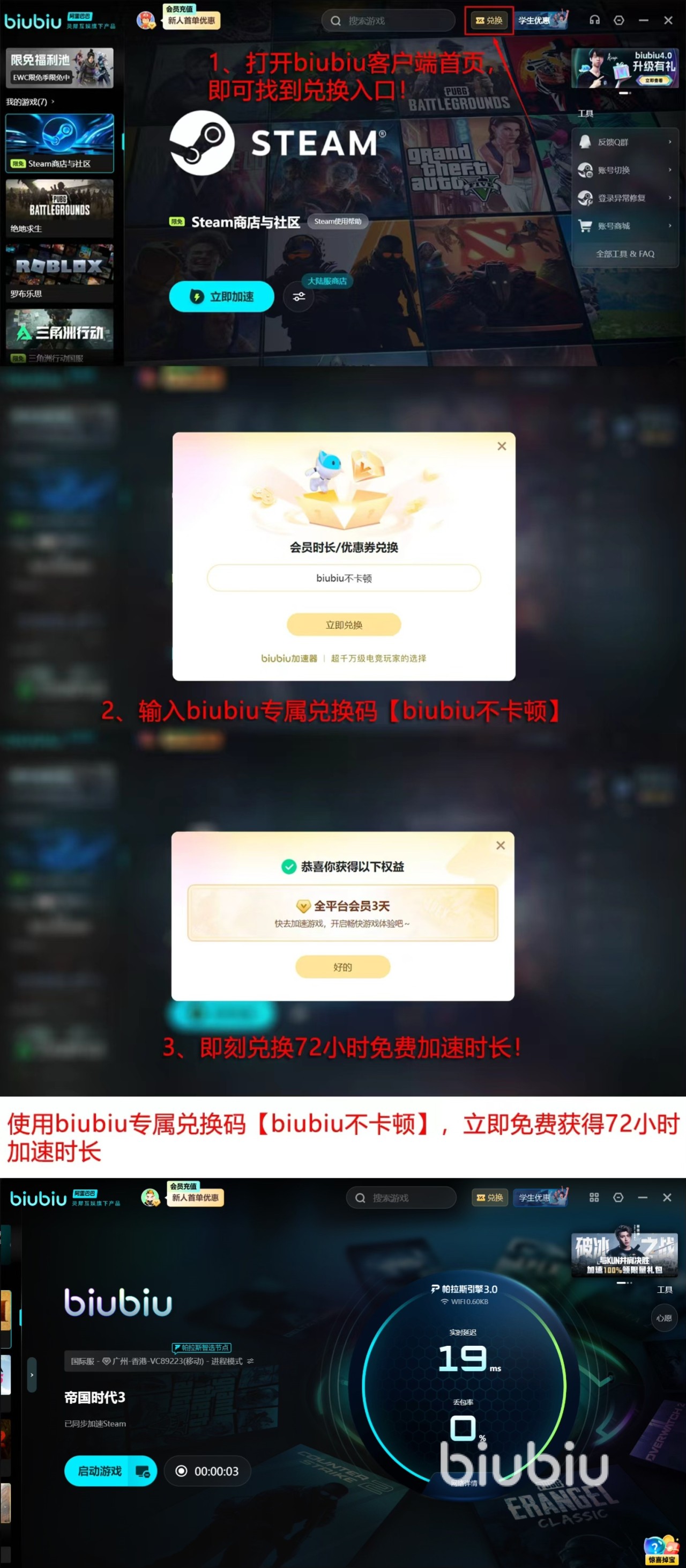 针对当前受卡顿影响的《帝国时代3》玩家,biubiu加速器提供即开即用的低门槛解决方案。新用户注册成功后,系统自动发放24小时全游戏加速时长;所有用户亦可通过输入兑换码【biubiu不卡顿】领取额外3天加速服务,无需额外付费即可体验优化效果。
