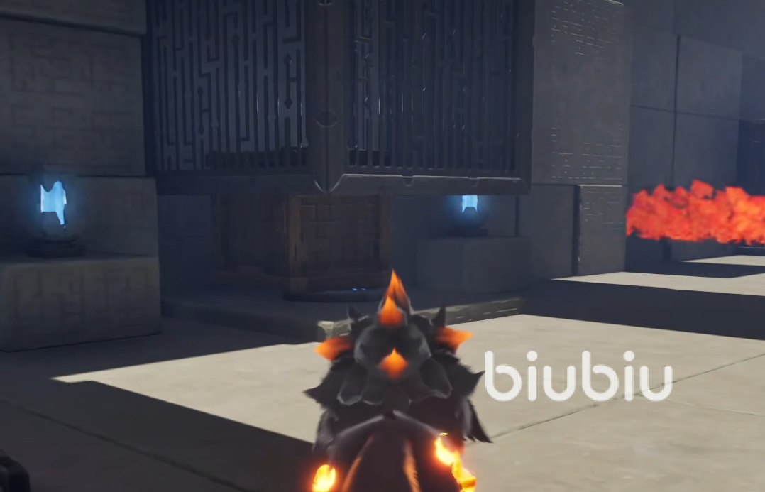 该伊莫核心技能为Q键释放火球,长按可锁定目标方向。前方密布多个木箱,使用火球逐一焚烧即可清除障碍;后续出现封闭铁门,需点燃门前火把激活机关,门体随即开启。进门后,左侧有被封锁的机关箱,先以火焰烧毁外层木箱,退出联结状态后取出内部机关装置,并将其投入指定喷火口,完成通路重置。