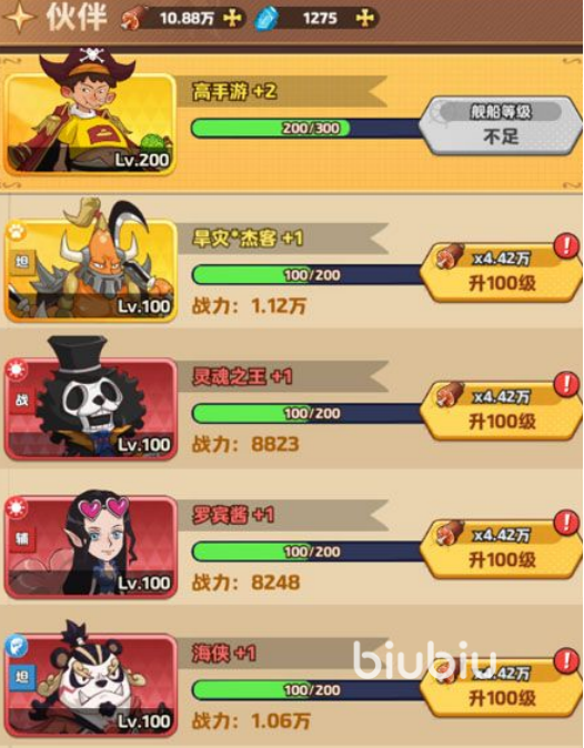 伙伴成长体系围绕“船长等级—伙伴上限—进阶突破”三阶段展开。主角船长等级直接决定全体伙伴可提升的最高等级;当伙伴达到100级或200级瓶颈时,需消耗钻石进行进阶,解锁更高战力阈值与新技能效果。配合传信系统,可进一步激活羁绊加成,提升团队协同作战能力。