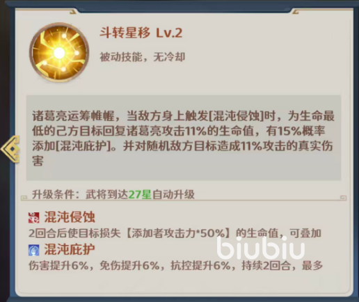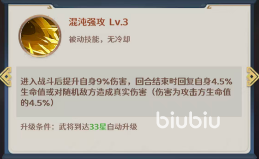 被动技【混沌强攻】在战斗开始时即赋予诸葛亮9%全伤害提升;回合结束时,根据自身当前生命状态智能生效:若血量健康,则对随机敌方造成相当于自身最大生命值4.5%的真实伤害;若处于低血量,则恢复自身最大生命值4.5%的生命。该技能于武将升至33星时自动升级,有效缓解传统法师生存压力与续航短板,使其无需额外配置治疗位即可维持中后期作战稳定性。