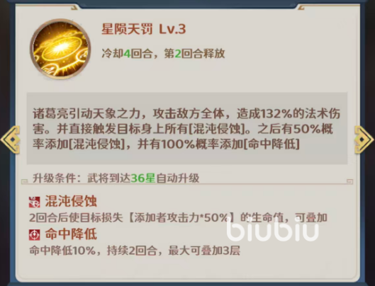 大招【星陨天罚】拥有4回合冷却,释放时对敌方全体造成132%法术伤害,并强制触发目标全部混沌侵蚀层数;成功触发后,有50%概率追加新混沌侵蚀,同时100%概率施加“命中降低”效果——使目标命中率下降10%,最多叠加3层。值得注意的是,每当混沌侵蚀被触发,诸葛亮将为己方生命值最低的单位恢复相当于自身攻击力11%的生命值。此外,该技能存在15%概率附加“混沌庇护”,提供6%免伤与6%抗控加成,大幅提升其在持久战中的容错率与站场能力。