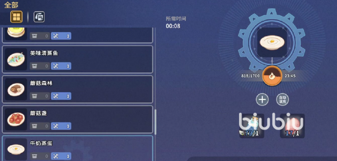 制作过程简洁明确:将鸵鸟奶与鸡蛋投入烹饪台,静待8秒即自动完成。该时长在全料理中属较短区间,利于批量生产。成品品质受烹饪等级直接影响——等级越高,产出星级越高,对应的生命恢复量与好感度加成效果也越显著。