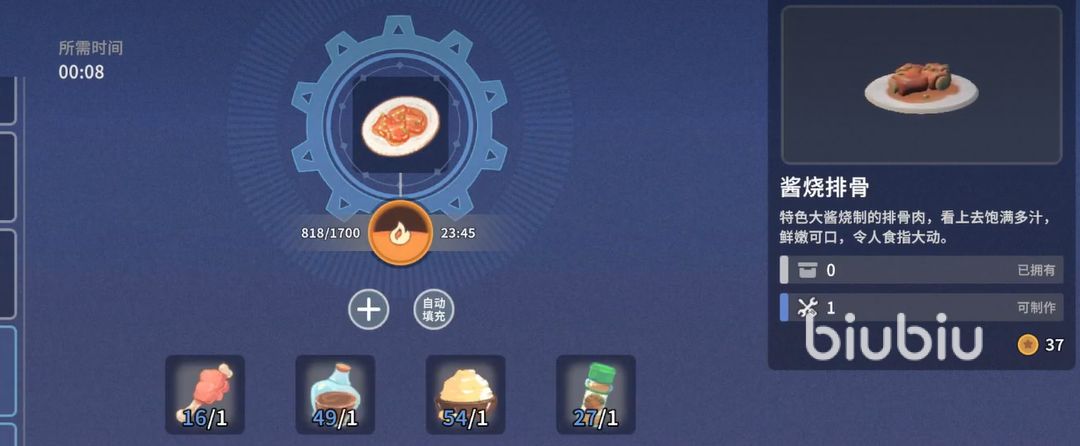 入门级料理如蜜汁油果,仅需蚁蜜与爆浆油果两种材料,适合新手快速上手。而排骨焖饭则需三样主料——排骨、米、爆浆油果,虽步骤略增,但提供的体力恢复量显著提升,特别适用于矿洞深挖或大型工坊订单前的能量储备。