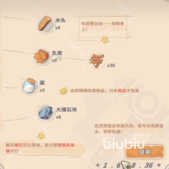 单台露水收集器所需材料如下:木棒×3(折合原木×9)、简单皮革×3、大理石砖×2、石槽×2。其中木棒为前期易得资源,砍伐林区树木即可稳定供应;其余材料则需分步筹备。
