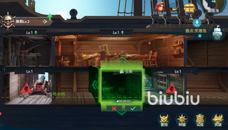 除战斗外,建造、贸易与探索构成三大支柱玩法。其中,船舱建设是资源转化与战力沉淀的核心载体。所有舱室均需消耗特定材料建造并升级,且不同功能舱室具备差异化增益属性。例如船长室直接关联指挥能力成长,优先建造可同步提升航速与防御两项基础数值——航速加成决定地图探索效率,防御加成则影响船体耐久上限,二者共同决定玩家在遭遇战中的生存容错率。