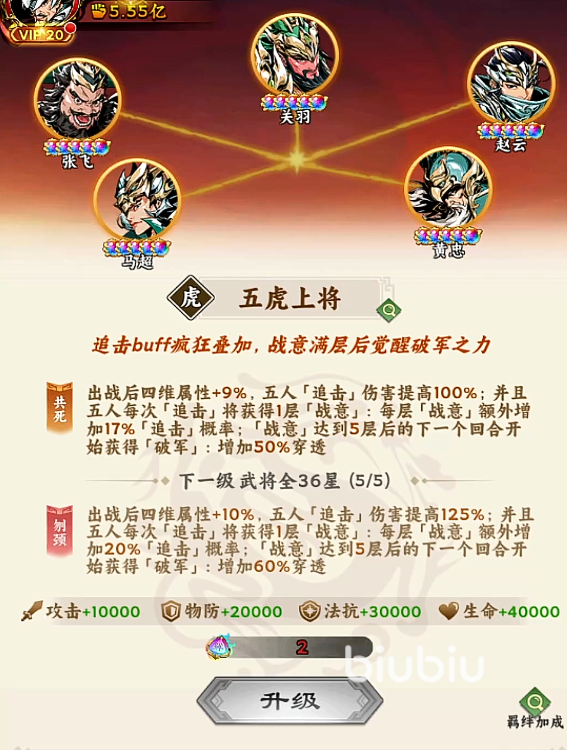 五虎上将阵容的首要羁绊为“追击强化”,可提升全队追击伤害倍率,最高增幅接近100%。该效果对依赖追击机制的武将尤为关键。赵云是此羁绊的核心受益者——其每次普攻均附带追击效果,且可在非自身回合触发追击,实现高频次连击压制;马超则通过被动技能提供额外追击概率,虽主动技能不带追击,但能与赵云形成稳定协同追击链,在短时间内打出爆发性输出。