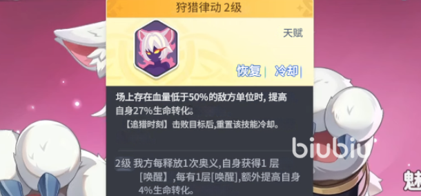 她的核心机制围绕“低血压环境增益”与“奥义循环”展开:当敌方存在生命值低于50%的单位时,自身吸血效果提升;若奥义成功完成击杀,则立即重置奥义冷却时间。升至6星后解锁二阶天赋,每次释放奥义可叠加“唤醒”状态,每层提供4%额外吸血率。后续天赋还包含攻击力加成、触发元素反应时的攻击提升,以及奥义击杀目标后获得2点奥义点数等关键效果。