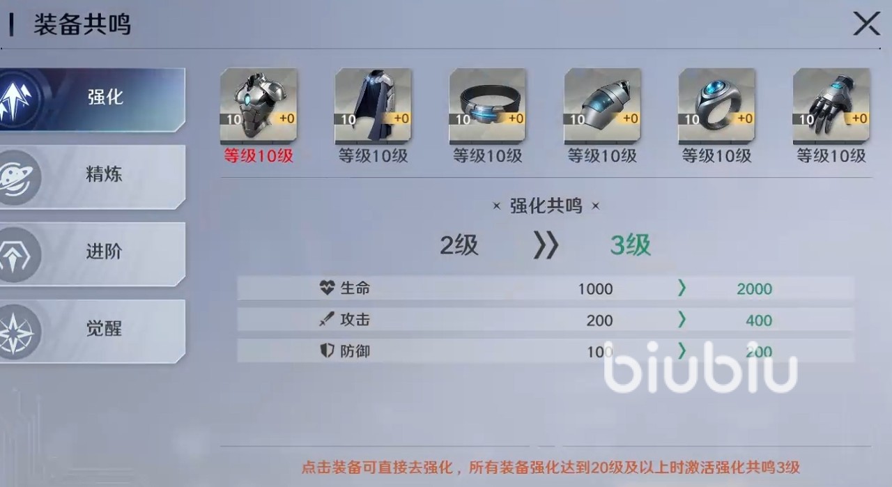 本作独创的“装备共鸣”机制,是角色战力跃升的关键突破口。该系统包含四大独立共鸣分支:强化共鸣、精炼共鸣、进阶共鸣与觉醒共鸣。当任意一项养成操作(如强化至5级、精炼至5级等)在四项路径中同步达成相同等级时,对应共鸣等级即自动提升,激活额外属性加成。该效果数值可观,是中后期战力构筑不可忽视的核心环节。
