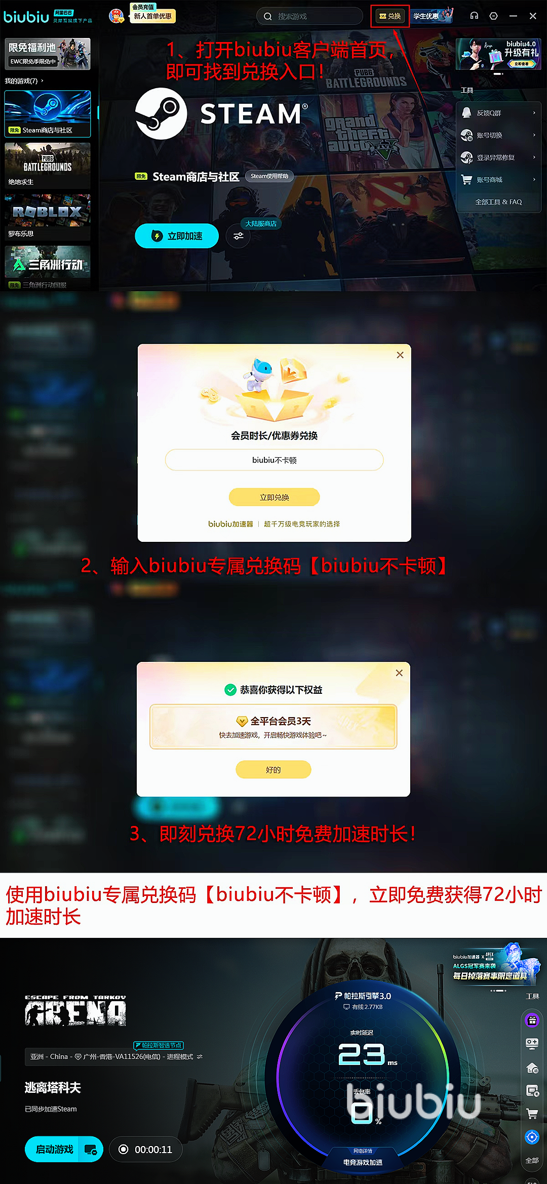 大量用户反馈,启用Biubiu加速后,国际服平均延迟下降40%以上,丢包率趋近于零,大幅减少因网络波动导致的强制掉线。目前新注册用户可享24小时全场游戏免费加速特权;输入兑换码【biubiu不卡顿】还可额外领取3天加速时长,累计达96小时,覆盖所有支持游戏,老用户同样适用。