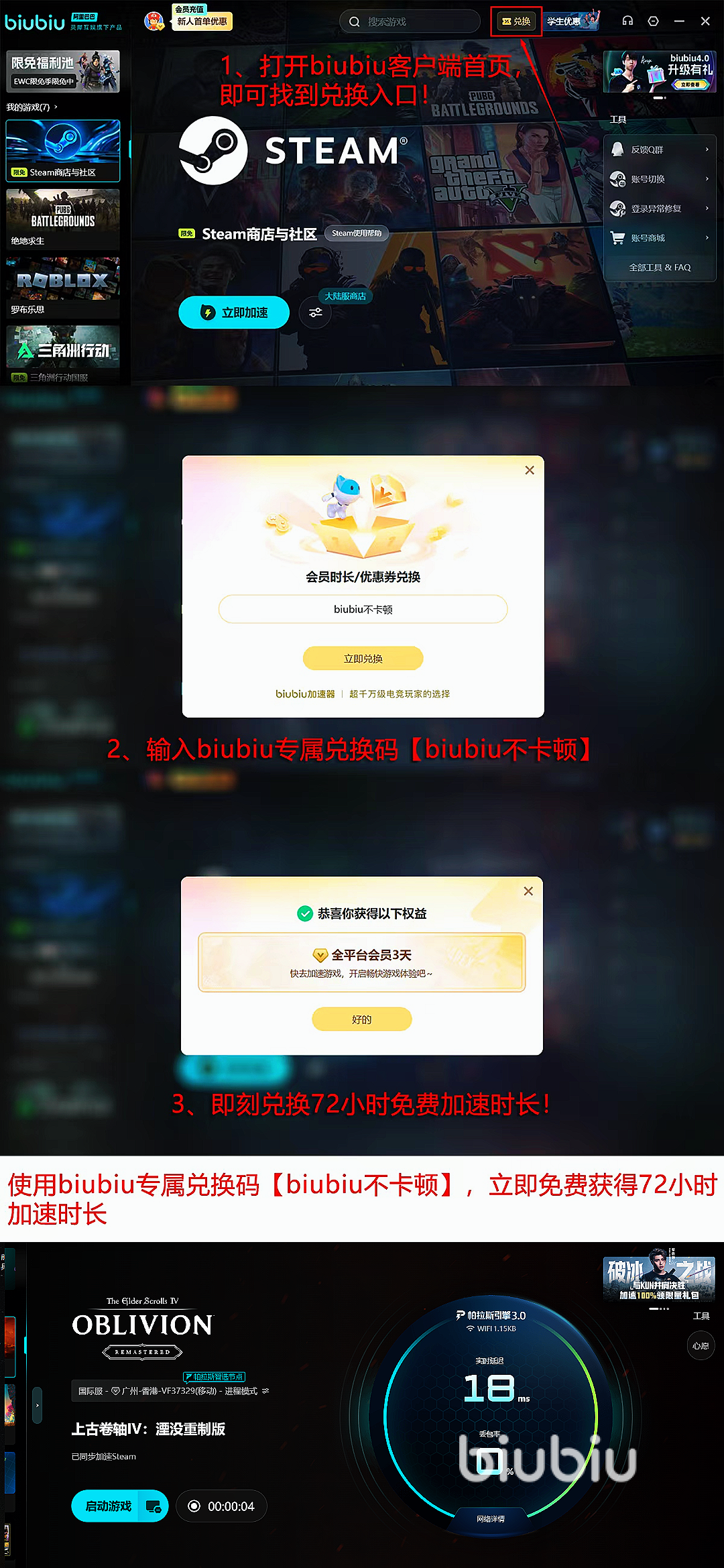除基础加速能力外,biubiu持续强化用户服务维度。新注册用户可即刻领取24小时全游戏免费加速权益;输入兑换码【biubiu不卡顿】还可叠加获得3天额外时长,总计享96小时加速服务,且该福利同样适用于国际服游戏场景。老用户亦可参与周期性回馈活动,持续获取加速时长与专属节点权限。