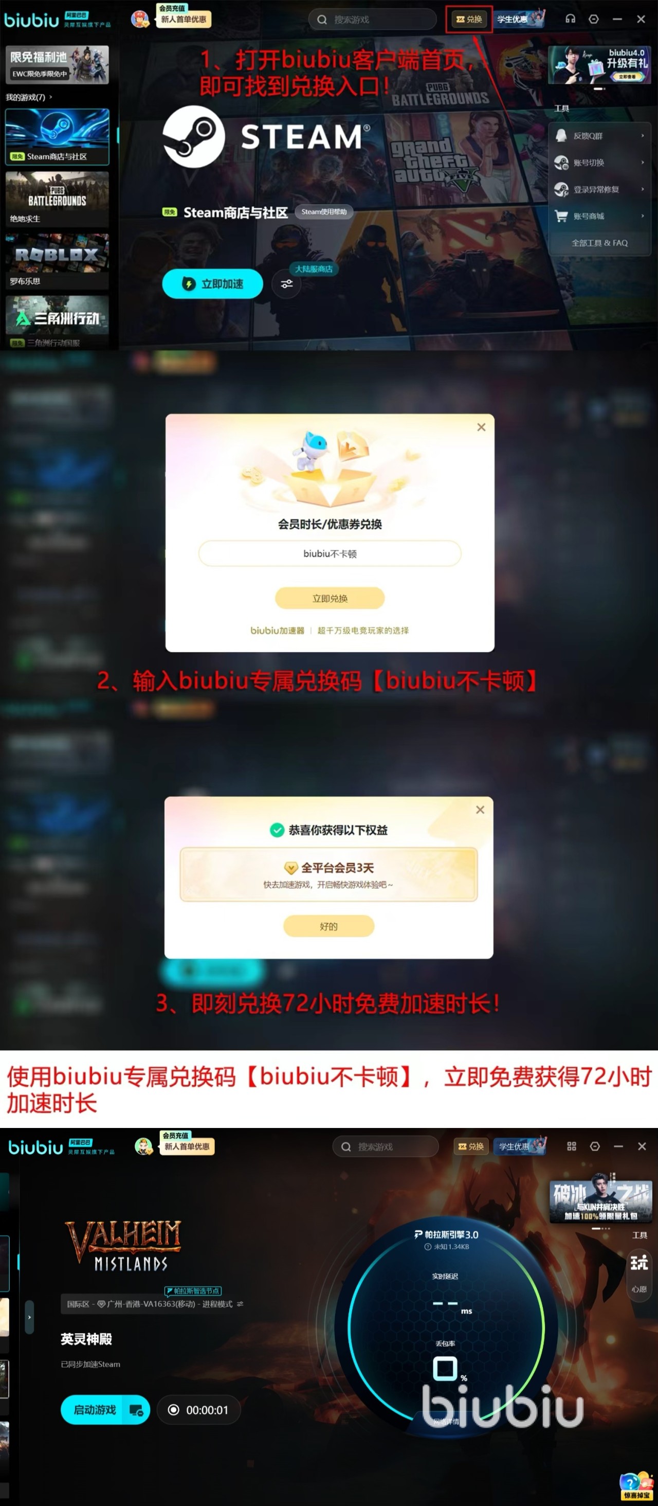 为降低用户尝试门槛,biubiu加速器推出零负担体验策略:新用户注册后即可自动激活24小时全功能试用权限;所有访问用户还可凭通用兑换码【biubiu不卡顿】免费领取3天高级加速服务,无需绑定支付方式或完成复杂任务。