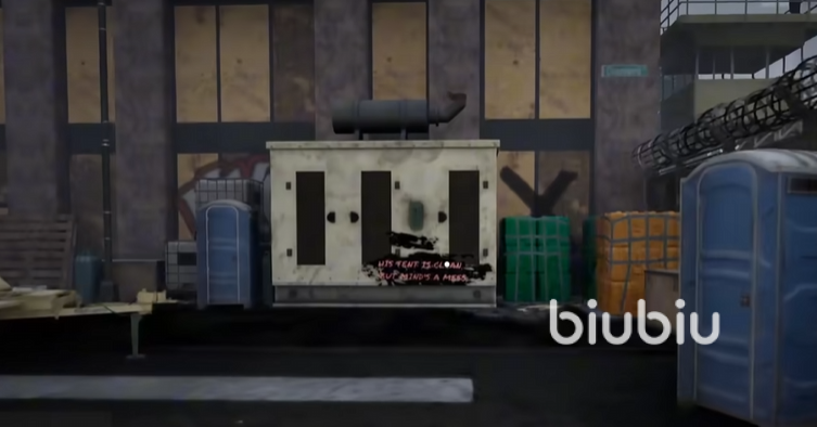 4、继续追踪新脚印,沿左侧墙体缓步前进至主入口附近。脚印在此处右拐,推开铁丝门后即回到初始宿舍区域。行至集装箱尽头,向左观察,宿舍外侧集装箱铁皮上刻有第四句:“还是妈妈的乖宝宝,老亚伯·克劳”。