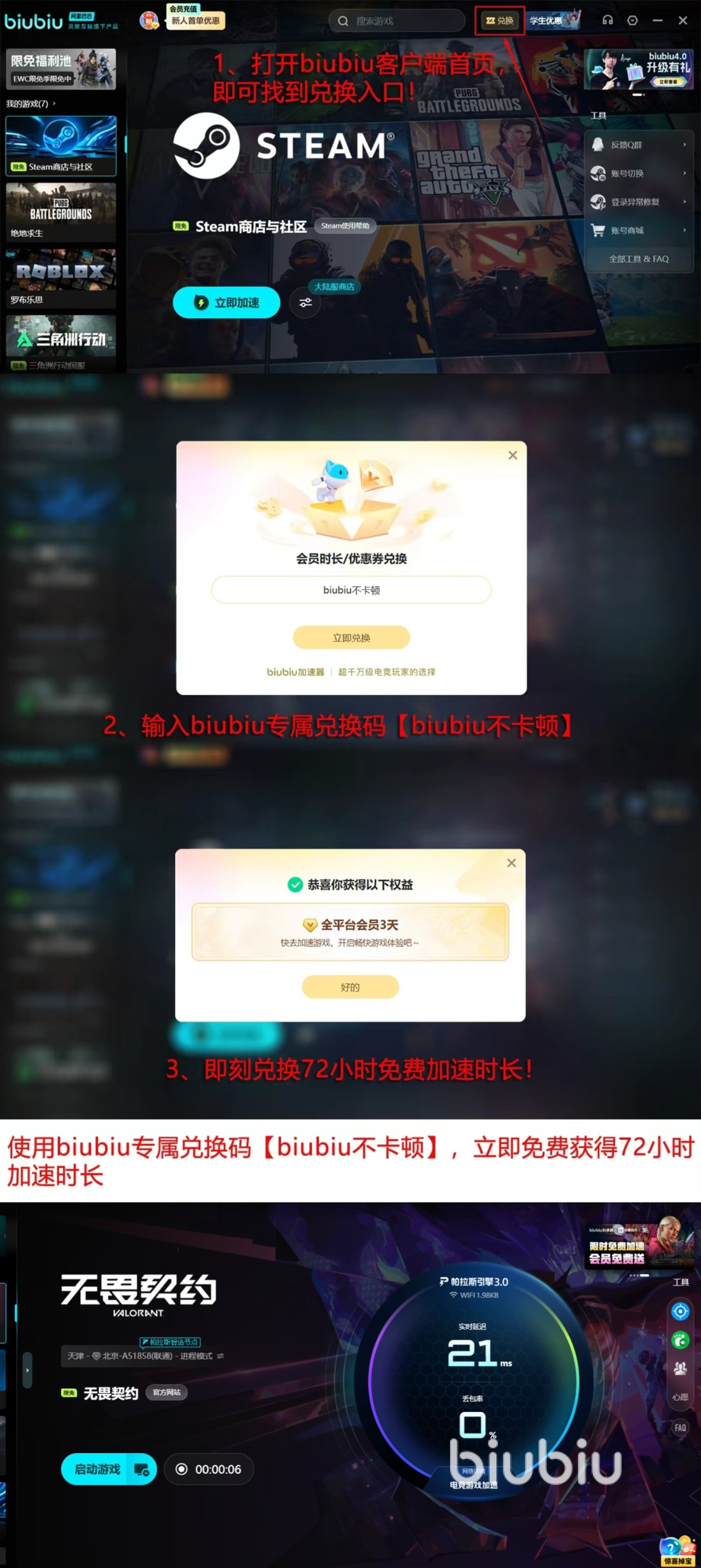 效果是否真实,需以实测为准。目前新用户注册biubiu加速器后,可立即获取24小时全功能加速时长,支持完整体验多局排位赛与竞技模式,直观对比加速前后的延迟曲线、命中反馈及走位流畅度变化。所有用户还可凭兑换码【biubiu不卡顿】免费领取3天高级加速服务,无需付费即可验证优化效果。