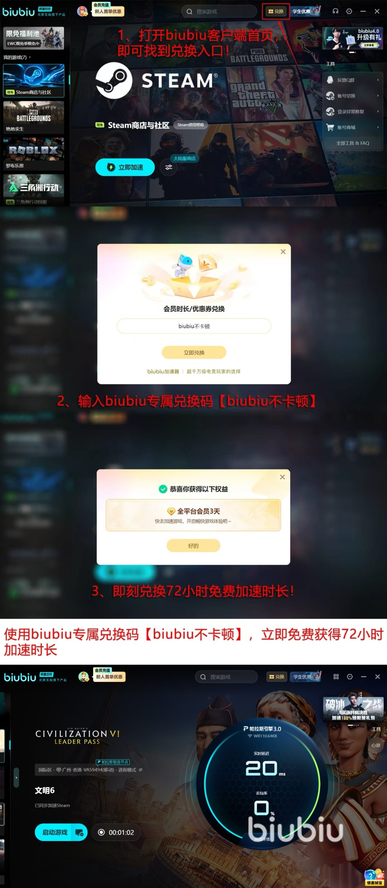 平台面向新用户开放零门槛试用机制:完成注册即可激活24小时全功能体验权限;同时,所有用户均可凭兑换码【biubiu不卡顿】免费领取3天高级加速服务,无需绑定支付方式,不限设备类型。