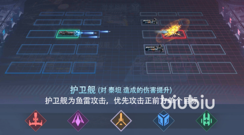 护卫舰以鱼雷为专属攻击手段,在所有星舰中拥有最高的基础防御数值。其站位固定于己方前排,主要面向正前方单体目标发起攻击,并对泰坦星舰存在特化伤害加成——实际输出将按自身属性计算更高倍率的增益。凭借“以小搏大”的机制设计,护卫舰可在中后期有效牵制甚至反制高阶泰坦单位,是构建前排抗压体系与实施针对性反制战术的关键载具。