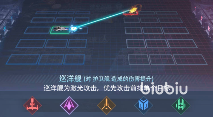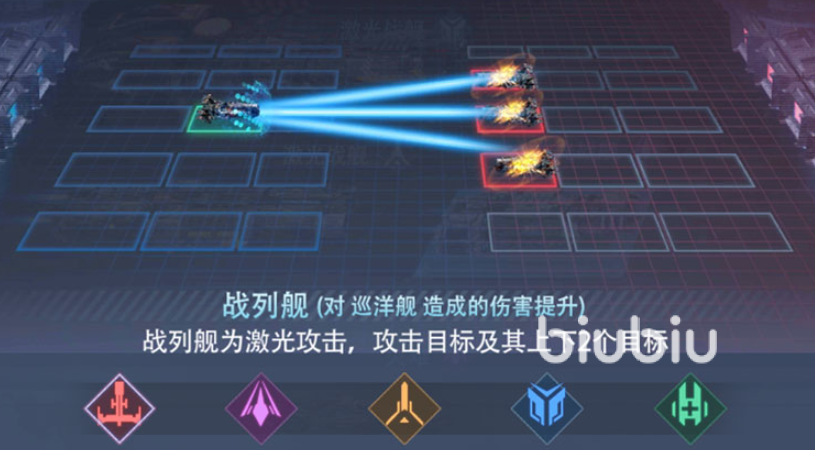 战列舰是典型的高爆发线性输出型星舰,以高能激光为主要武器,具备贯穿式伤害特性。其攻击范围覆盖目标所在横排上下相邻两格,形成“一列三格”的纵向打击面。该特性使其在面对密集阵型时具备极强的破阵能力,尤其针对巡洋舰单位可触发额外伤害加成。前期清场效率高,中后期仍能稳定承担主力DPS角色,适用于需要快速瓦解敌方横向布防的战术场景。