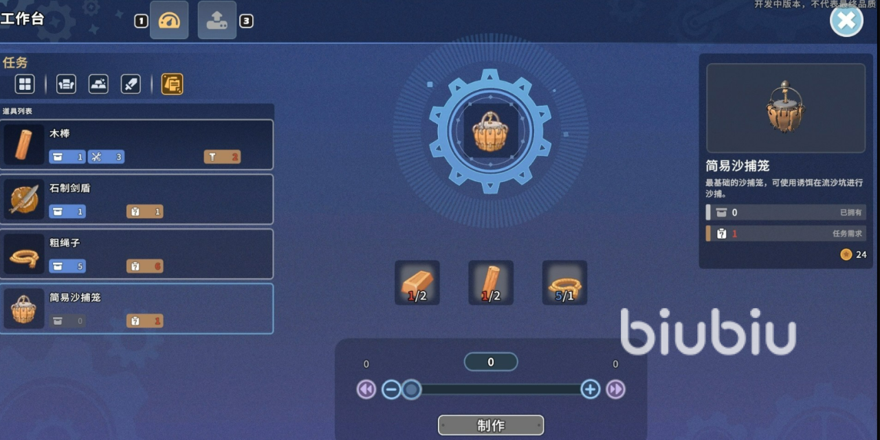 第一步是制作核心道具——沙捕笼。该装置不可直接购买,必须通过工作台手工合成。所需材料固定为:铜锭×2、木棒×2、粗绳×1。其中铜锭可在矿洞底层稳定采集;木棒由基础木材经加工台处理获得;粗绳则可通过完成早期支线或资源箱开启获取。材料齐备后,打开工作台界面,选择对应配方即可完成制作。