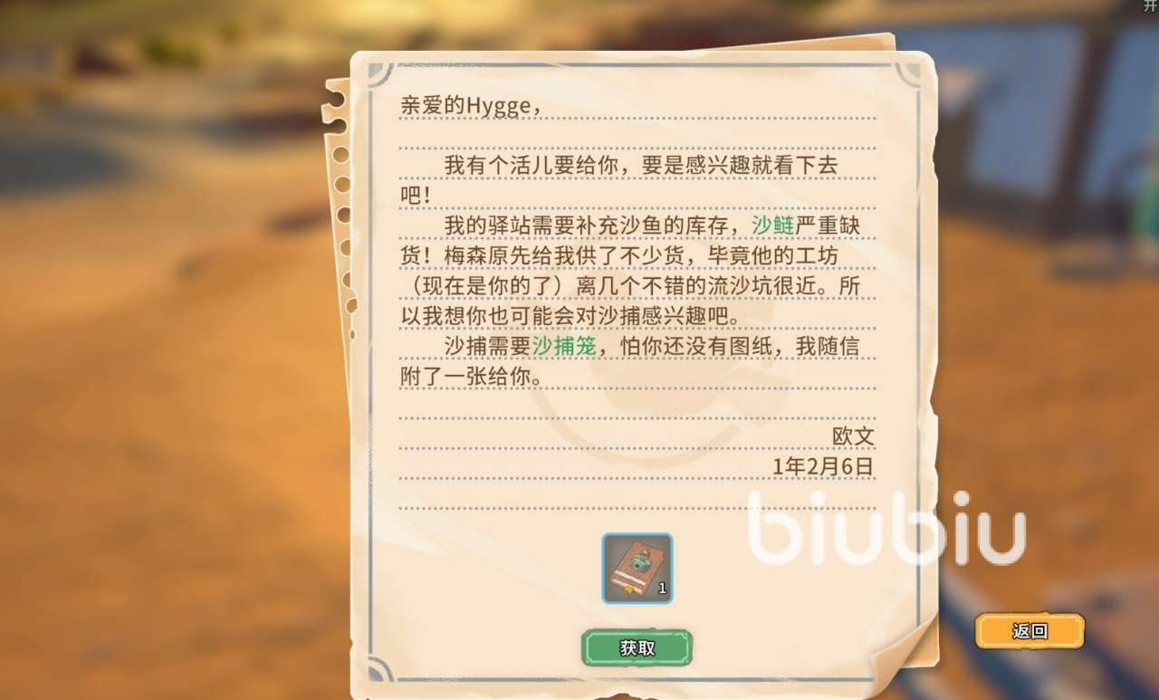 特别说明:欧文发布的初始教学任务明确要求捕获沙鲢×3。完成数量后,返回与其对话提交成果即可推进主线。该任务不仅提供基础奖励,更是解锁后续沙捕图鉴、升级配方及稀有生物捕捉权限的前提条件。