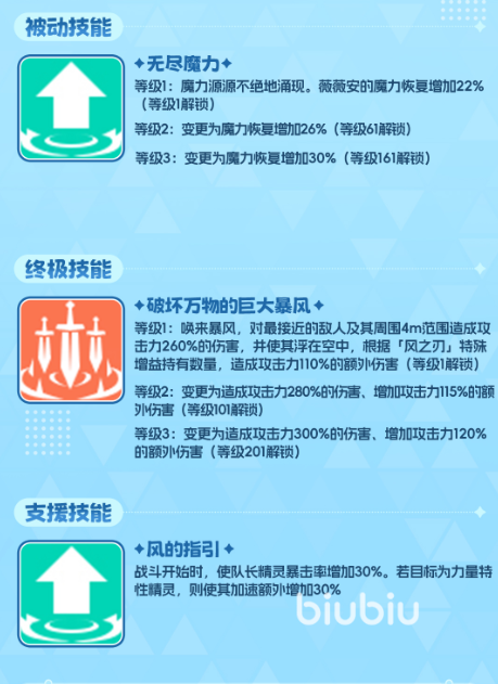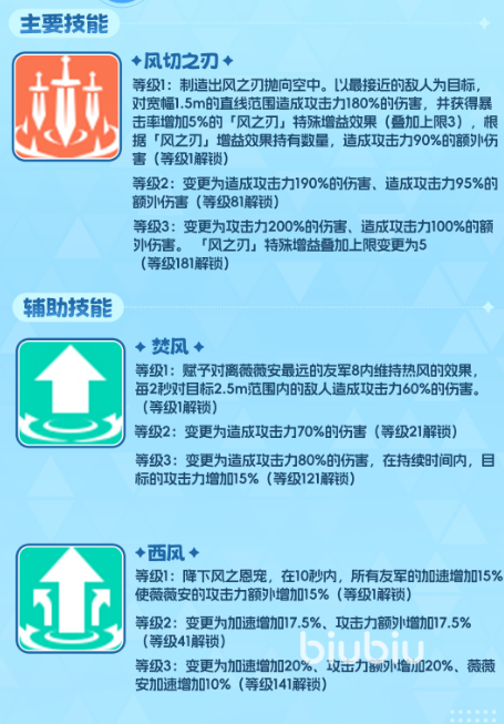 主动技能【风之刃】为薇薇安的核心输出技,可对前方扇形区域造成多段风属性伤害,并随技能等级提升显著增强基础倍率与附加风刃数量。该技能同时附带两项关键增益效果:【焚风】提升范围内全体友方单位攻击力;【西风】则同步提高薇薇安自身及周围队友的移动速度,大幅优化走位与连招节奏。