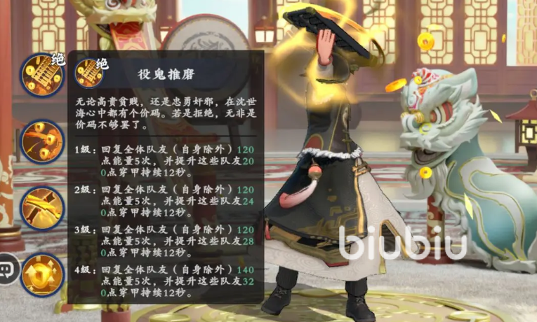第二位推荐角色为辅助向武者——桃姬。她并非传统治疗型角色,而是以“百分比护盾”为核心机制构建团队容错体系:基础技能可基于自身属性为全队提供高额比例护盾,大招进一步强化护盾强度与覆盖范围。虽攻击成长路径较慢,但其护盾具备稳定吸收伤害、延缓敌方节奏的关键作用;同时,部分技能附带团队增益效果,能有效提升队友输出循环效率,特别适合缺乏优质功能性辅助的玩家阵容。