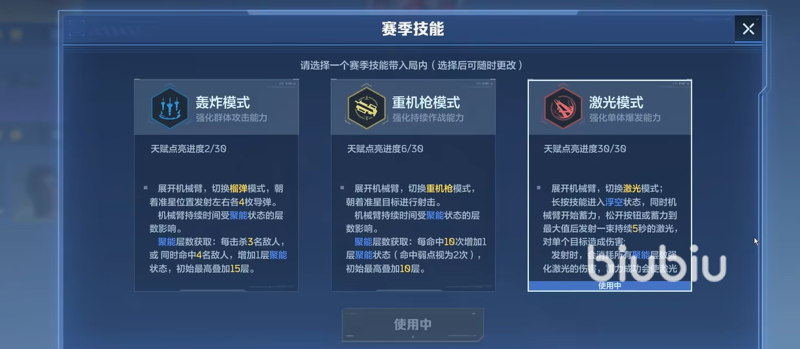 赛季天赋点数完全绑定赛季等级,每提升一级即自动获得固定数量的天赋点,无需额外任务或充值获取。当前系统划分为三大专属路线:激光模式、重机枪模式、轰炸模式。三者并非强度排序,而是功能定位差异——激光模式聚焦单体精度强化,适用于狙击枪、射手步枪等高瞄准需求武器;重机枪模式侧重持续火力输出,对突击步枪、冲锋枪、机枪类武器的压制能力有显著增益;轰炸模式则专精范围伤害,适配榴弹炮、火箭筒、霰弹枪等具备AOE特性的装备。