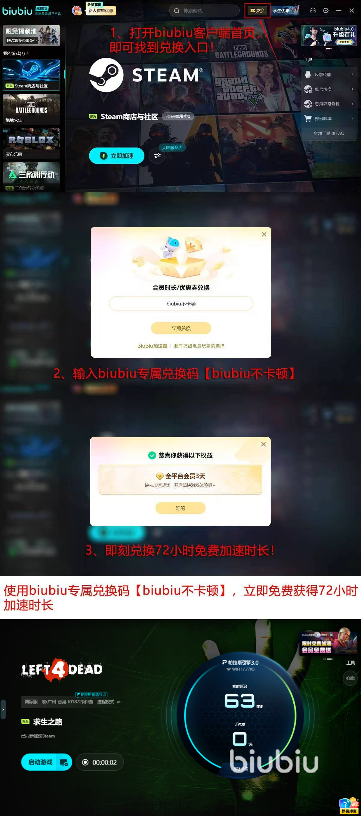 现在使用biubiu加速器就可验新用户福利,注册成功之后即可激活首日无要求使用权限24小时,输入【biubiu不卡顿】再继续无忧畅玩72小时,也就是说新用户最高可以获得96小时的使用时间。