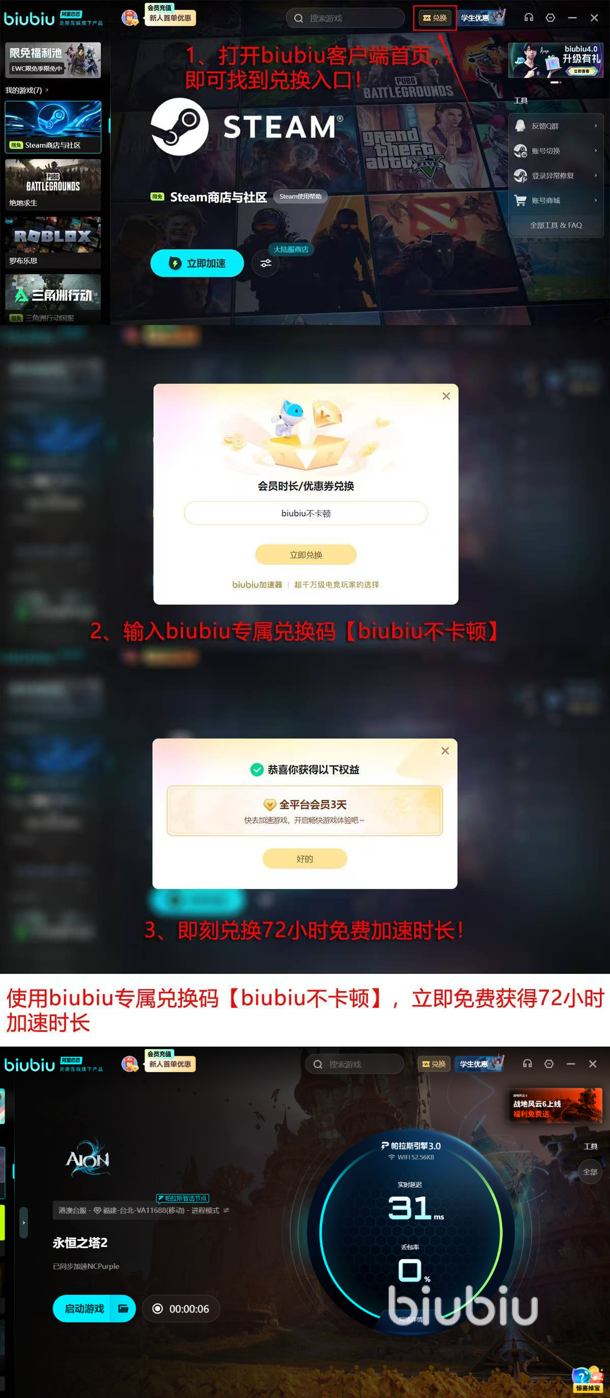 新用户注册后立刻获得首日免费加速24小时,输入【biubiu不卡顿】零成本体验激烈团战72小时,两项福利叠加,新人用户总共可以畅享顶级加速体验长达4天。