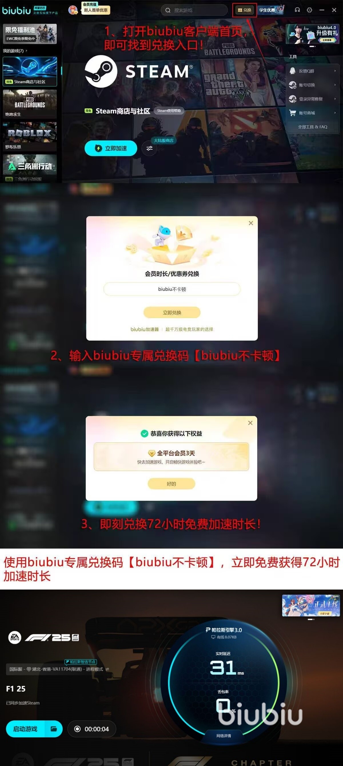 现在的平台都是先充值再体验,很多的资源不够以及服务不完善的问题持续困扰着大家,而biubiu就是工具为了可以让更多的伙伴尝试到专业的性能,现在特别为大家推出了兑换口令领取奖励活动,只要在兑换的界面输入【biubiu不卡顿】就可以领取到72个小时的免费会员体验权限,全平台的所有功能都没有任何限制要求,而且这个口令对所有的用户都算数。如果你是第一次尝试的话,还能额外得到平台送给大家的24h免费新人礼呢。