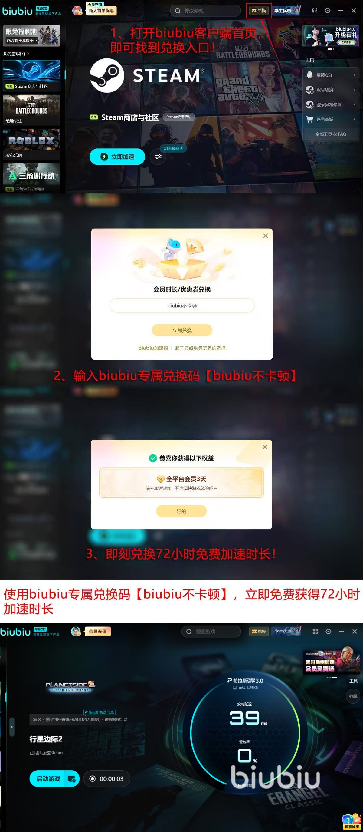诚意邀请行星边际2的新兵加入,注册biubiu新账号即可获得重磅福利,首日流畅试用权限24小时,输入【biubiu不卡顿】继续体验宏大战场72小时,两步操作,叠加畅享总计长达4天的顶级加速服务。