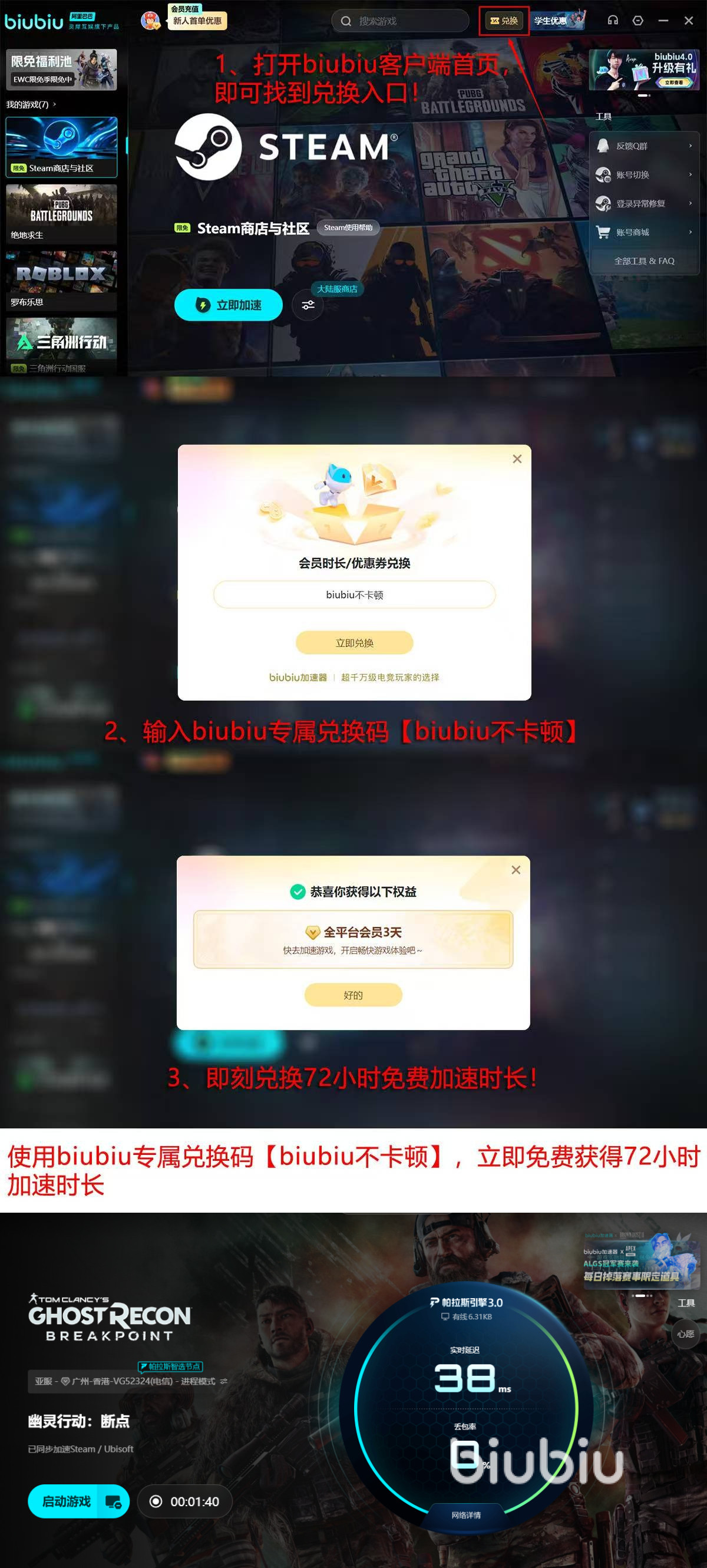 为帮助新用户切实验证优化成效,biubiu加速器提供分阶段试用权益:完成首次注册即可激活24小时全功能加速权限;额外输入兑换码【biubiu不卡顿】,还可叠加领取72小时高级加速时长,总计96小时免费体验周期,足以覆盖《幽灵行动:断点》多个高强度任务线及极光岛全域探索流程,便于用户在真实对抗环境中全面评估性能表现。
