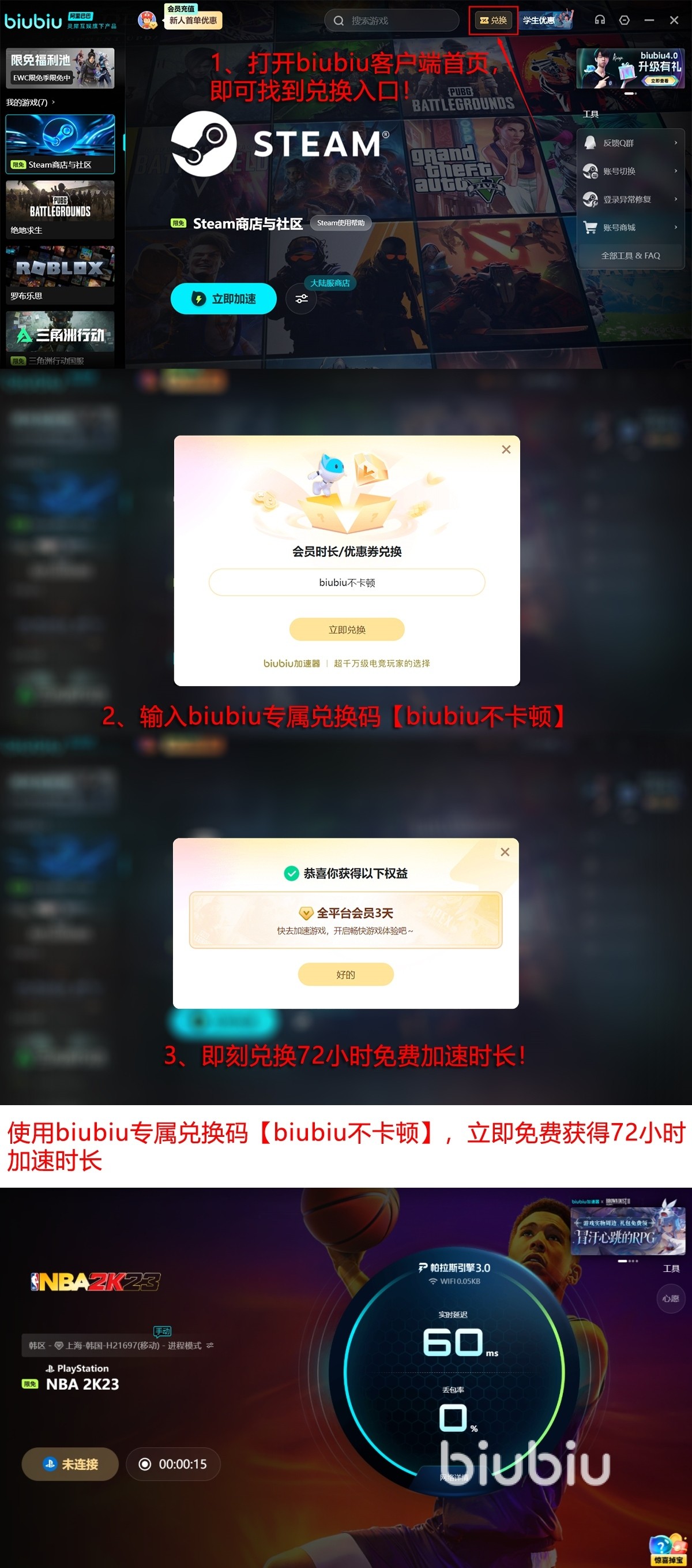 新注册用户可立即获得 24 小时全功能试用权限。所有用户输入福利码【biubiu不卡顿】,还可额外激活 3 天全功能加速服务,足够支撑完整赛季体验或深度球员培养流程。