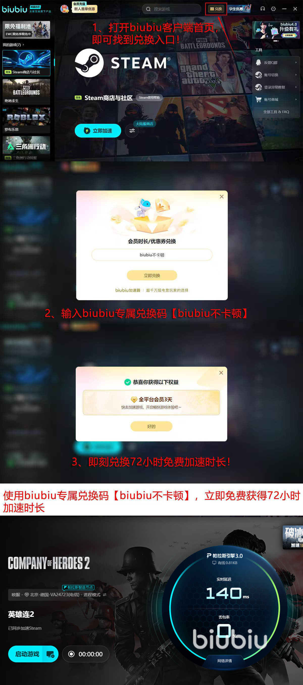 若你正面临频繁掉帧、闪退或连接中断困扰,可立即开启免费试用。新用户注册后自动获得24小时全功能体验权限;另可通过首页“兑换”入口输入口令【biubiu不卡顿】,额外领取72小时加速时长,累计达96小时,充分验证实际效果。