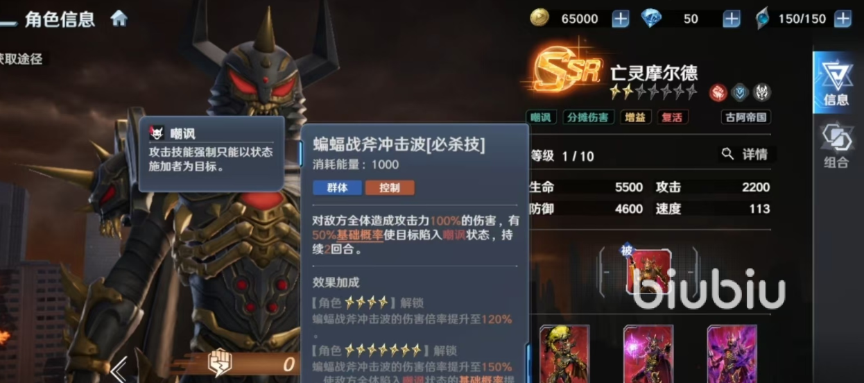 亡灵摩尔德的核心战力根植于一套高度协同的双机制系统:强制嘲讽与被动“卷土重来”深度耦合。其必杀技“蝙蝠战斧冲击波”兼具大范围群体伤害与概率转向控制效果,可有效引导敌方火力集中自身,保障后排输出单位的生存空间。配合“暗黑恩赐”触发的伤害链接状态,该角色在古阿阵营中承担着不可替代的承伤枢纽与战术锚点功能。