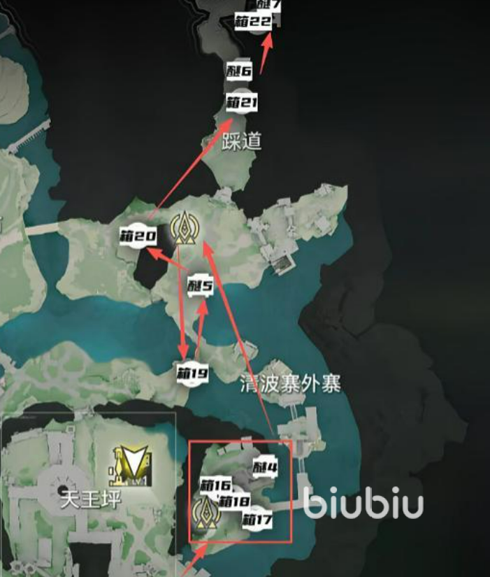 天王坪右上角区域资源密度较高,共含醚质7处、宝箱22个。该片区地形开阔但遮蔽物较多,推荐启用鹰眼模式进行系统性扫描,避免因视角盲区导致遗漏。