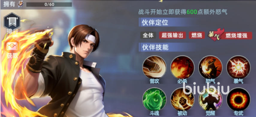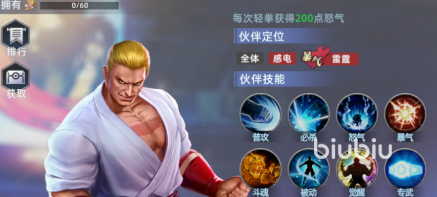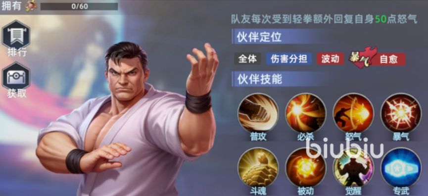 坂崎琢磨承担前排承伤与战术控制双重职责。其必杀技可使指定敌方单位在本回合内完全免疫所有伤害,同时恢复自身生命值;怒气技能为多段锁定打击,在回合结束时额外造成超然伤害。当生命值降至阈值以下时,自动触发暴气回血机制;升至2星后解锁“重拳”被动,实现持续自动续航。比利则定位为功能性削弱者,其必杀技可降低目标必杀技与怒气技的免伤率,有效放大全队真实输出效率。