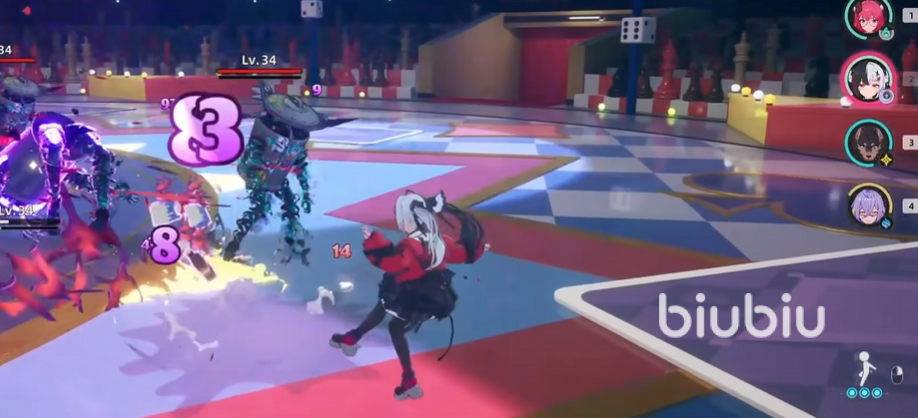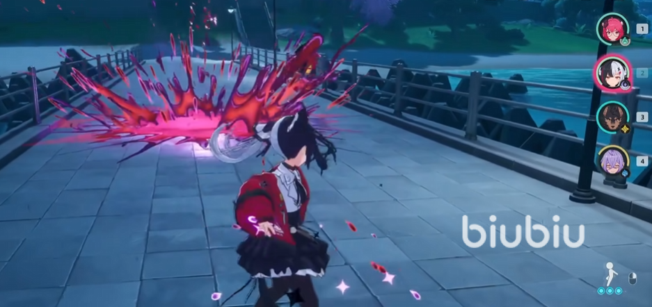 她的普通攻击共五段:前四段为远程颜料弹发射,具备范围溅射效果,可同时打击多个目标;第五段则切换为肩扛式颜料炮进行蓄力轰击,伤害集中且附带明显击退效果。在瞄准状态下,准星两侧会浮现对称羽翼图标,提示当前锁定状态稳定。