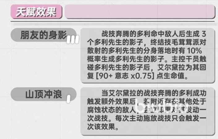 天赋体系是艾尔黛拉机制联动的关键枢纽。“朋友的身影”为核心被动,当主控干员接触多利先生留下的影子时,除自身获得治疗外,艾尔黛拉将自动对当前生命值最低的另一名友方单位施加等额50%的额外治疗,形成双线保障结构。“腐蚀转化”天赋进一步强化战技功能性——每次通过战技清除腐蚀状态,均稳定附加脆弱效果,无需额外判定;而终结技专属天赋则优化其使用体验:持续时间延长1秒、生成影子概率提升、技力消耗降低15%,三者共同提升技能循环稳定性与覆盖率。