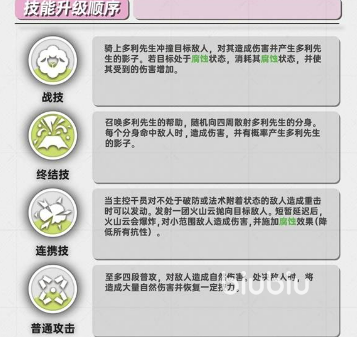 技能培养需遵循明确优先级:战技为首要升级目标。该技能召唤多利先生对路径敌人发起冲撞,造成物理伤害并清除目标身上的腐蚀状态;每次成功消耗腐蚀,均可为对应敌人施加持续5秒的“脆弱”效果,使其受到的伤害提升10%。该机制直接强化全队输出效率,且释放频率高、覆盖率广,升级后治疗量与伤害增幅显著。终结技位列次优,虽非主力治疗来源,但具备群体伤害与范围瞬发治疗双重特性,在高压关卡或Boss战中具有不可替代的战略价值。连携技主要用于主动施加腐蚀状态,为战技触发脆弱效果提供前置条件,培养优先级较低,建议在资源充裕后再逐步提升。普通攻击为四段式连续打击,造成自然伤害;击杀敌人时可恢复技力,此特性在清理低阶杂兵阶段能有效缩短技能循环周期,但普攻本身不承担核心治疗职能,治疗输出仍依赖战技与终结技的协同释放。