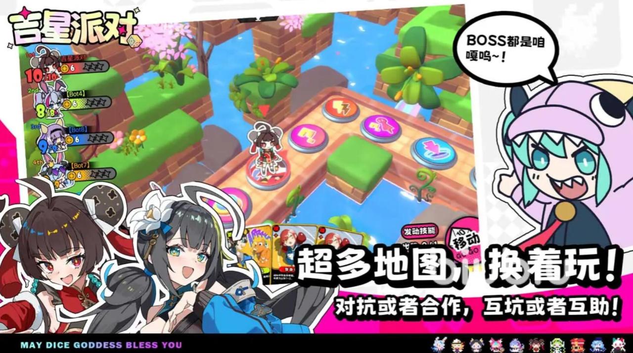 在玩法层面,《吉星派对》融合了经典大富翁式行棋机制与策略卡牌系统,每位角色拥有专属技能,玩家需结合手牌效果、地形事件及对手动向进行动态决策。每回合节奏紧凑,既考验临场判断力,也保留适度随机性——地图中隐藏的特殊格子、突发的全局事件、稀有卡牌掉落等设计,让每一局对战都充满变数与新鲜感。