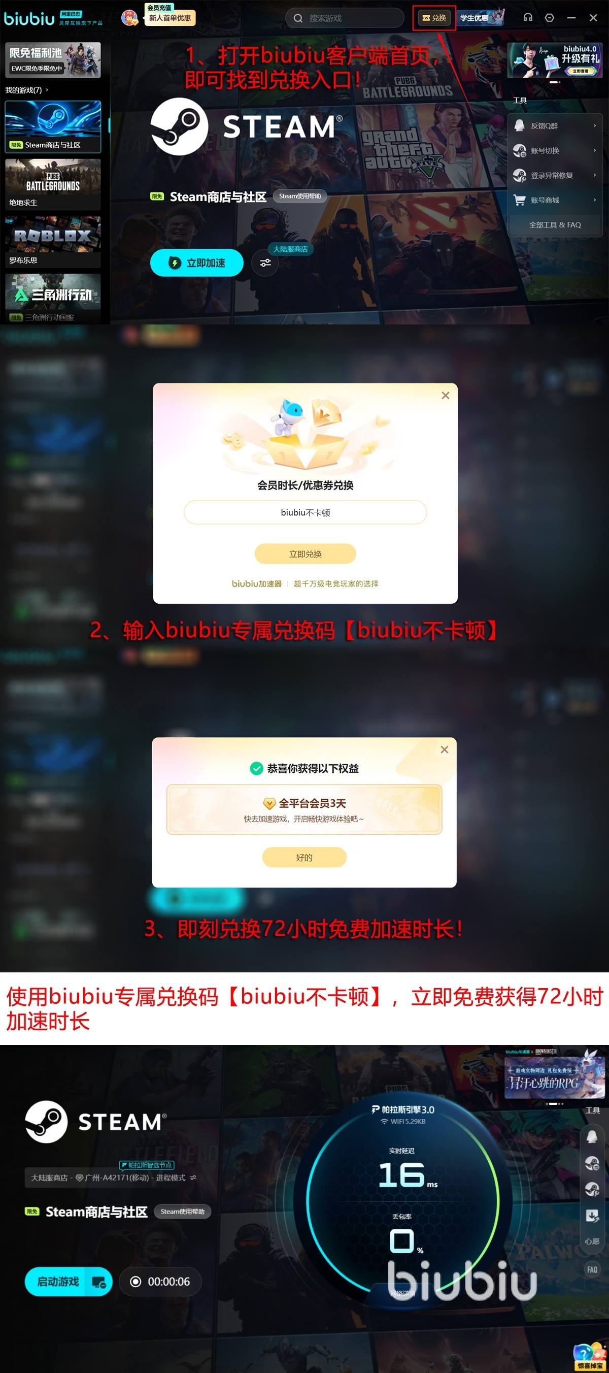 产品设计注重易用性,新用户注册即享24小时全功能免费加速权限。为扩大体验周期,官方同步开放限时兑换码【biubiu不卡顿】,成功领取可额外获得72小时加速时长。叠加首日权益后,新用户总计可获得96小时无限制加速服务,充分覆盖主流3A及电竞大作的深度体验需求。