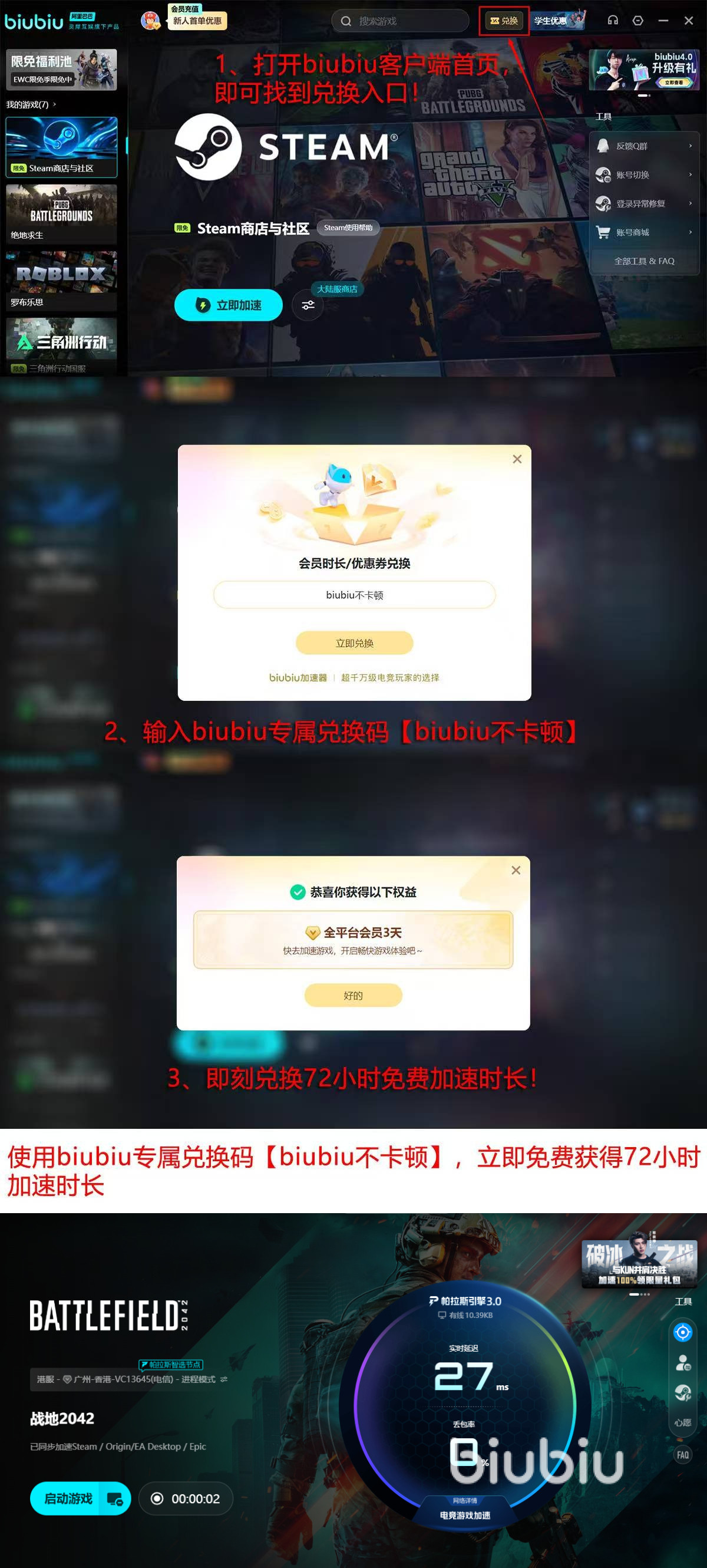 实际效果需以真实使用为准。新注册用户可免费获得24小时基础加速服务,输入激活码【biubiu不卡顿】还可额外解锁72小时高级功能权限,总计享有多达96小时的全场景试用周期,全面评估其在不同网络环境下的适配能力,避免非理性付费决策。