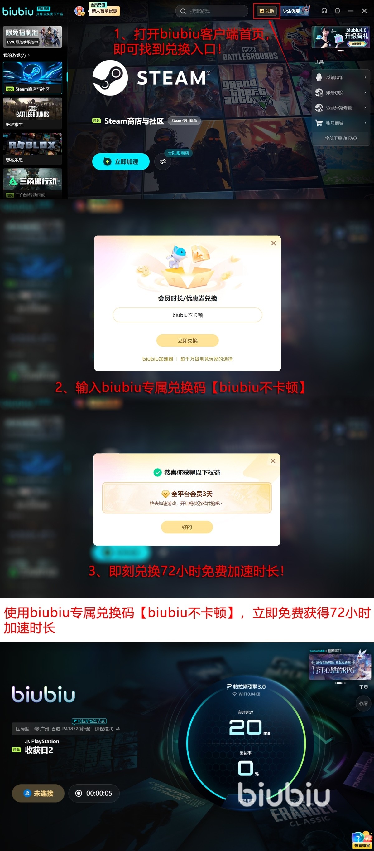 新用户完成首次注册并登录后,系统将自动发放24小时全功能免费加速时长。此外,所有用户均可凭兑换口令【biubiu不卡顿】领取额外3天不限节点、无使用门槛的加速权益,支持即开即用、随时暂停,实测运行期间未再出现黑屏、强制退出等异常现象。