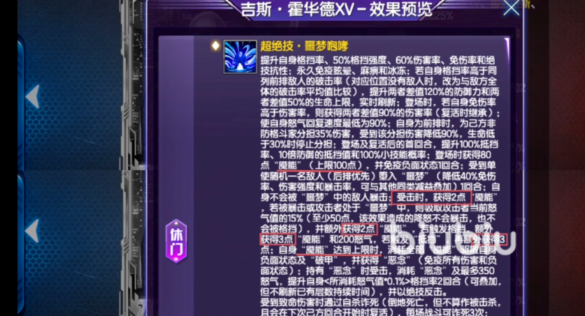 吉斯定位为强攻型核心输出,其战斗体系围绕“魇能”与“电感”双轨机制展开。登场即获得80点魇能,并免疫负面状态1回合;每次受击额外获取2点魇能。当魇能达到上限时,自动消耗全部魇能,清除自身所有负面状态及破甲类减益,并进入“恶念”状态——该状态下,吉斯将完全免疫一切伤害与负面效果。此外,其超绝技【噩梦咆哮】可提升自身格挡率与格挡强度各50%,伤害率提升60%,并永久免疫眩晕、麻痹、冰冻等控制效果。